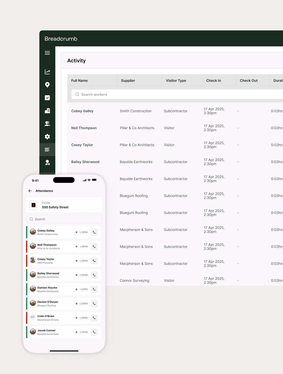 Big crews, busy mornings, pens that mysteriously vanish. With paper, slow starts and frustrated teams are practically guaranteed. Breadcrumb gets workers and visitors signed in in seconds, giving you an instant, accurate record of everyone on site.