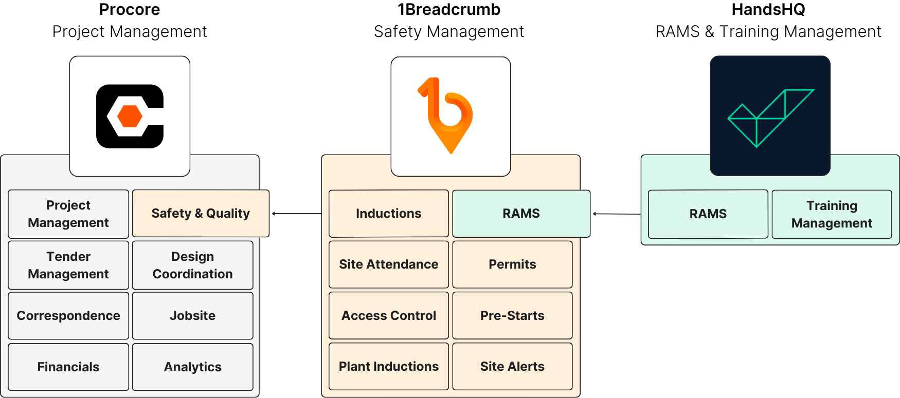 Preview of how construction systems Procore, Breadcrumb and HandsHQ integrate.